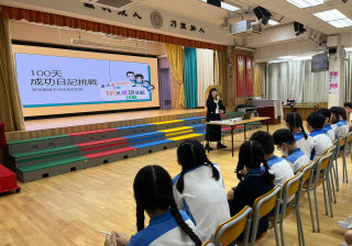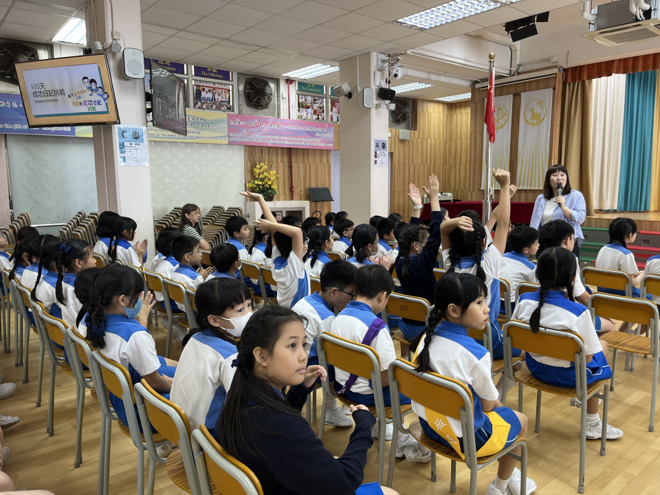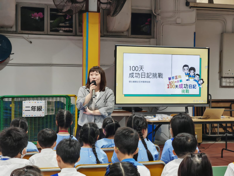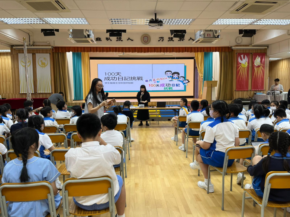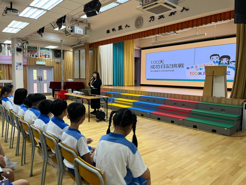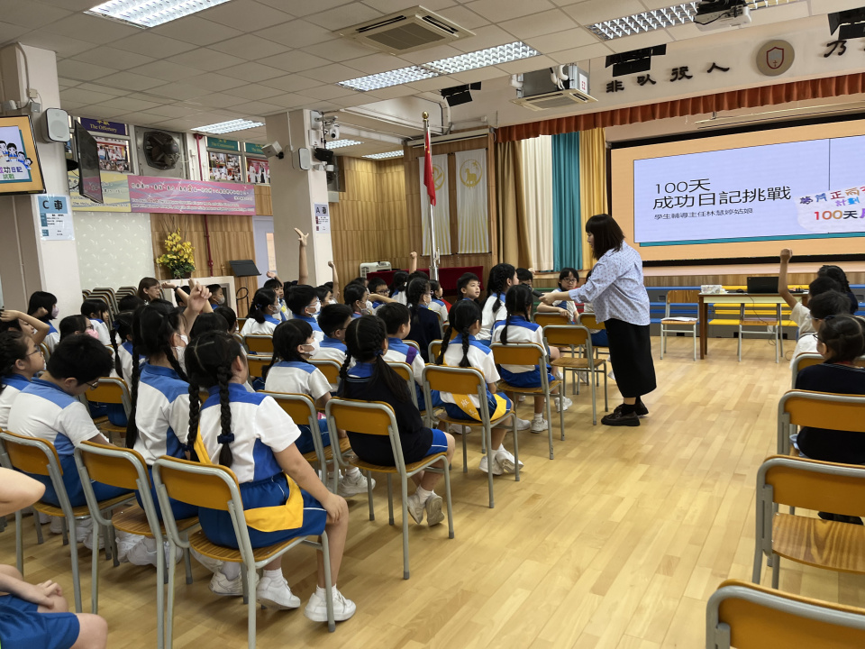 學生輔導主任林姑娘向同學們介紹了本年度 的校本輔導活動——《100天成功日記挑戰》。同學們對此表現出極濃厚的興趣,紛紛表示願意參與。我們也邀請了家長們一起嘗試完成這項挑戰,現時已有許多家長積極響應!希望同學們完成挑戰後,將日記交給輔導組,以換取「獎勵襟章」,即可以在學期結束前在校內佩戴。此外,同學們和家長可以一起合作,在學期結束前完成挑戰,從鄧校長手中領取獎狀呢!