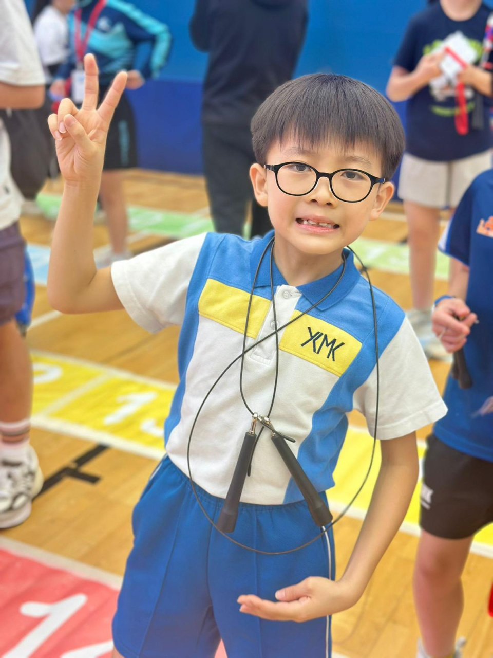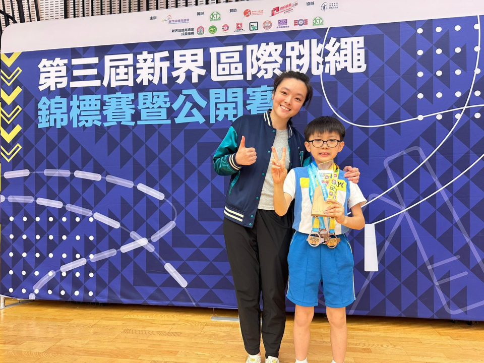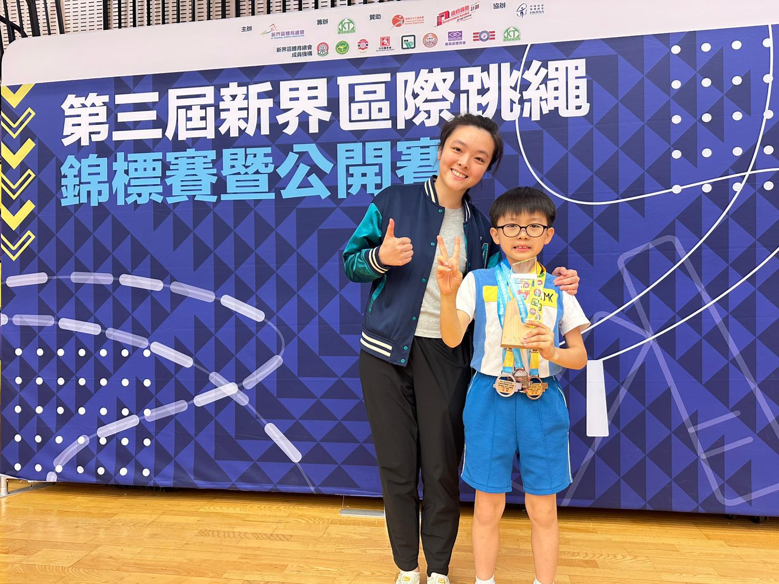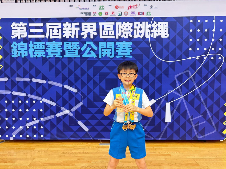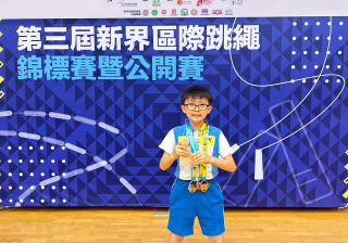 我校4E班王贍德同學在第三屆新界區際跳繩錦標賽暨公開賽中取得佳績,分別在「電子繩個人賽30秒二重跳 」取得亞軍;「30秒開合腳跳」及「30秒單車步」均取得季軍;電子繩個人賽10歲組別總成績獲全場總季軍。比賽過程中,贍德充分展現了體育精神,並憑藉出色的發揮獲得佳績,為校爭光。