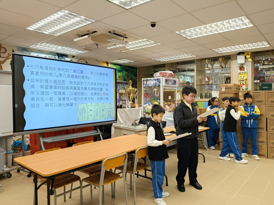 6A班的林思齊和李炎桐同學以生動的簡報介紹了中國古代的七巧 板除了展示七巧板的起源與歷史背景,還詳細說明了它的玩法與 背後的數學原理。為了加深同學們的理解,他們特別設計了互動 題目,現場答對的同學可獲得獎勵。此次活動兼具知 識性與趣味性, 充分展現了中國數學的悠久歷史與智慧。