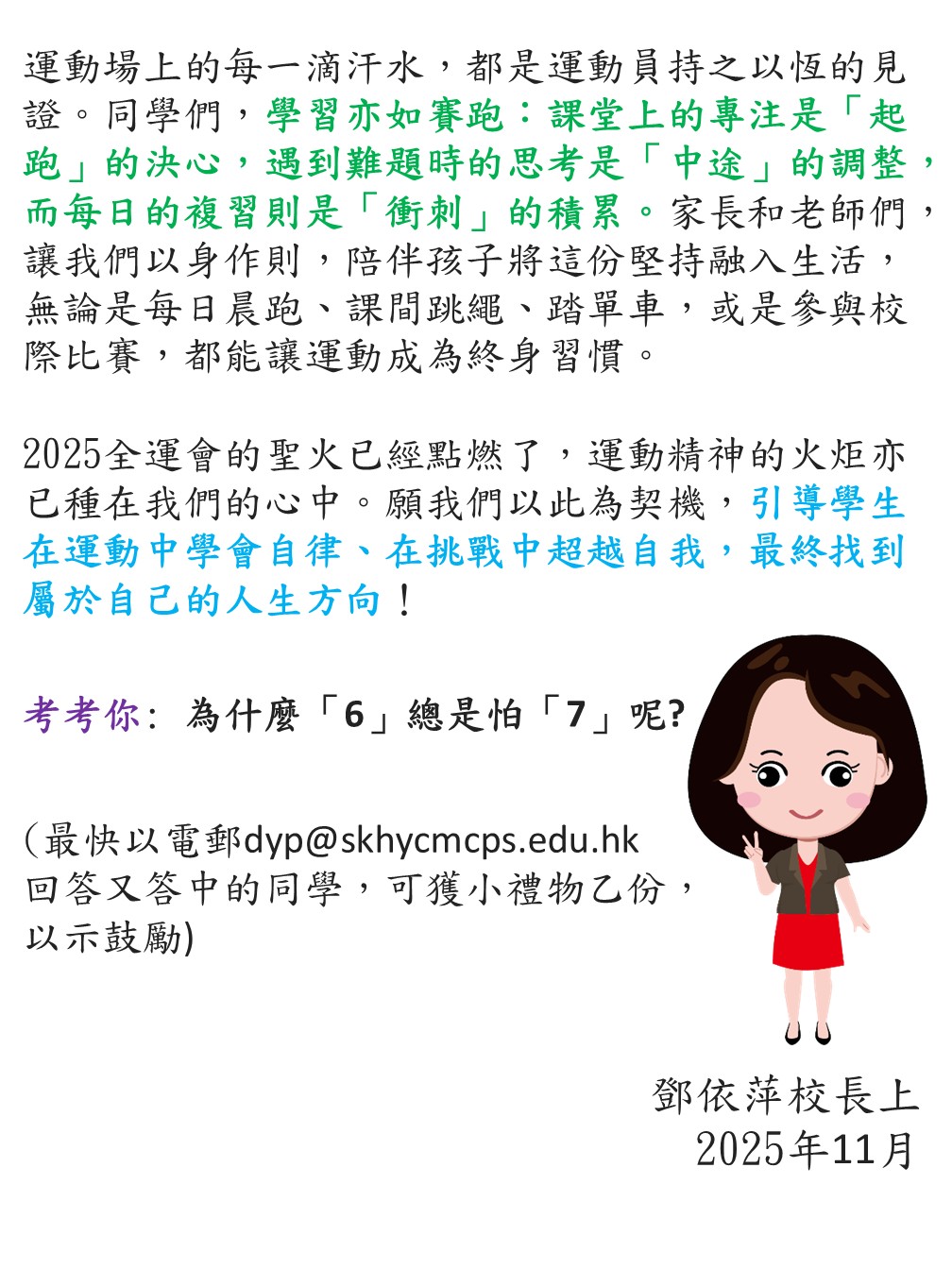 我校18位同學(2024年度)1B 居曉正、1C 蔡彧澤、鄧允祈、周承軒、2A 蘇允晴、文梓澄、2E 羅建旻、3A 廖衍博、王贍德、陸遙、3D 鄭皓瞳、3E 陸悠、4A 姚晞嵐、4C 陳曉晴、5A 鄺昱帆、5B 曾梓揚、6B 黃奕萄及6C 黃依蕾於6月28日參與了2025年度全港分區小學跳繩比賽。比賽過程中,同學們充分展現了體育精神,並憑藉出色的發揮獲得佳績:5人次榮獲項目冠軍、9人次獲亞軍、8人次獲季軍、3人次獲殿軍,為校爭光。