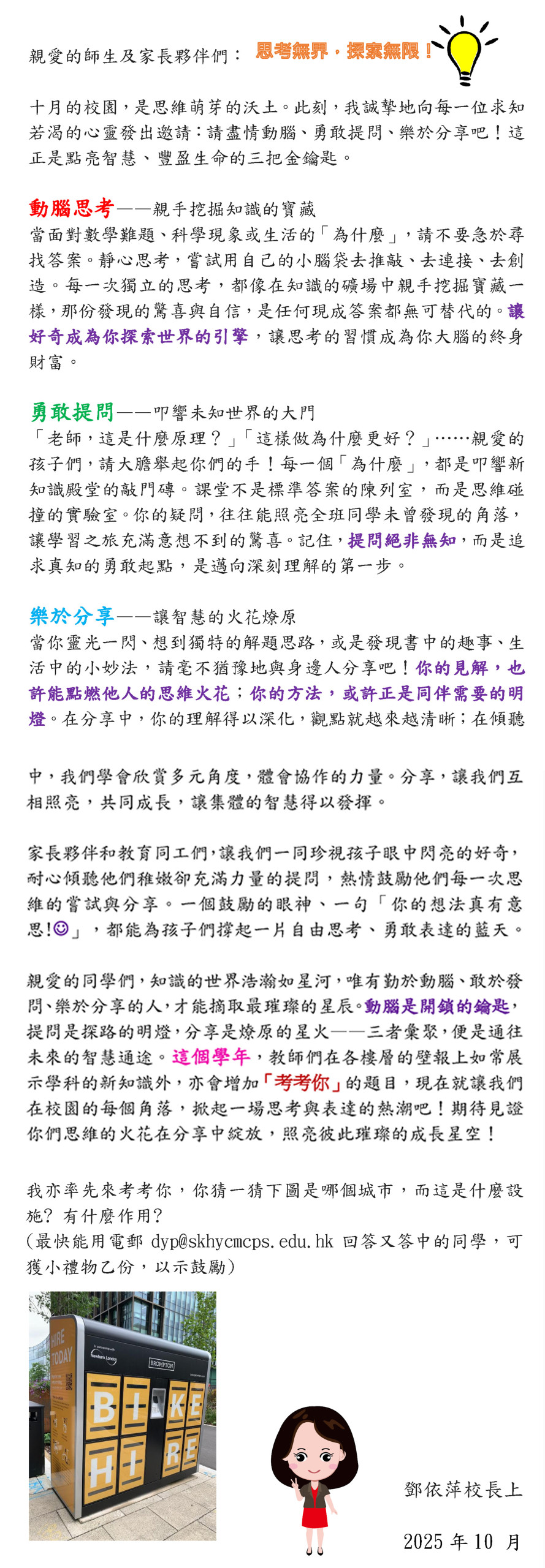 「學貴慎始」,開學日是子女的大事,本校極重視家長與子女間親密的親子關係,故鼓勵家長於開學周陪伴學生一起上學,與孩子同行,迎接新學年的開始。