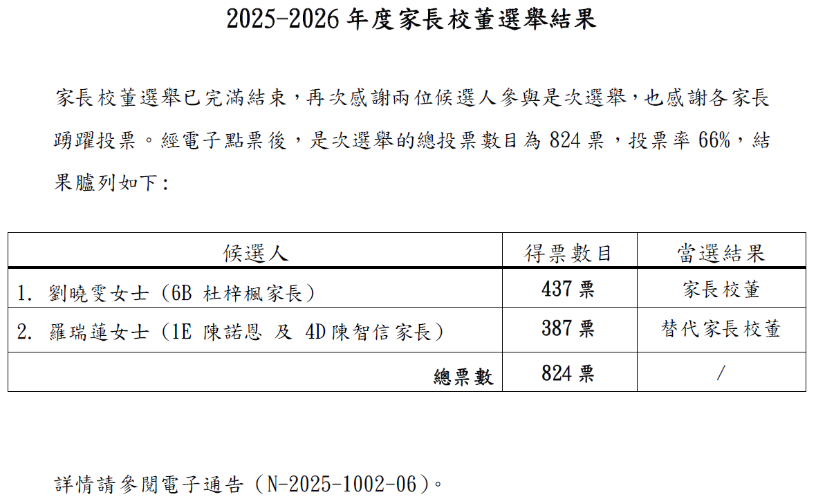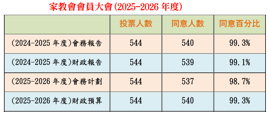 家長教師會已於2025 年9 月29 日(一)至10 月2 日(四) 透過網上電子通吿形式向全體家長教師會會員發布:上年度(2024-2025 年度)會務報吿及財政報吿,以及本年度(2025-2026 年度)的會務計劃及財政預算,並收集全體會員的意願,結果如下: