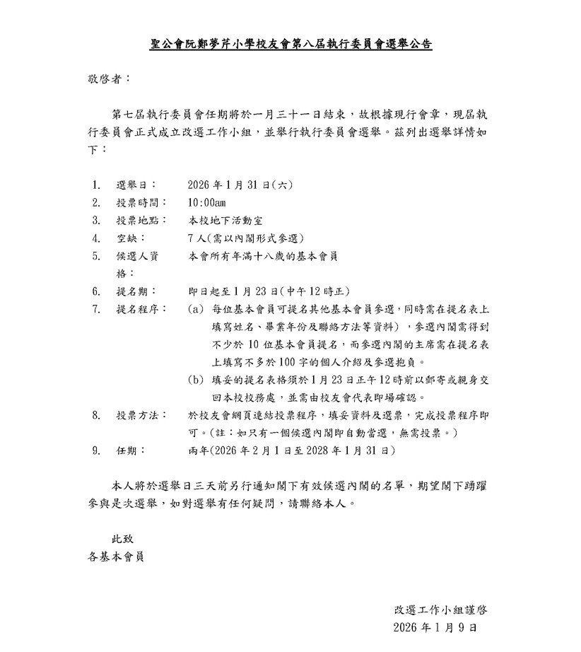 有鑑於聖公會阮鄭夢芹小學已正式成立法團校董會,本會有必要修改會章以配合母校法團校董會的要求,因此執行委員會謹訂於二零一四年十月十一日(星期六)下午十二時三十分至一時三十分假本校禮堂召開第三次會員大會。是次會議議程如下:
