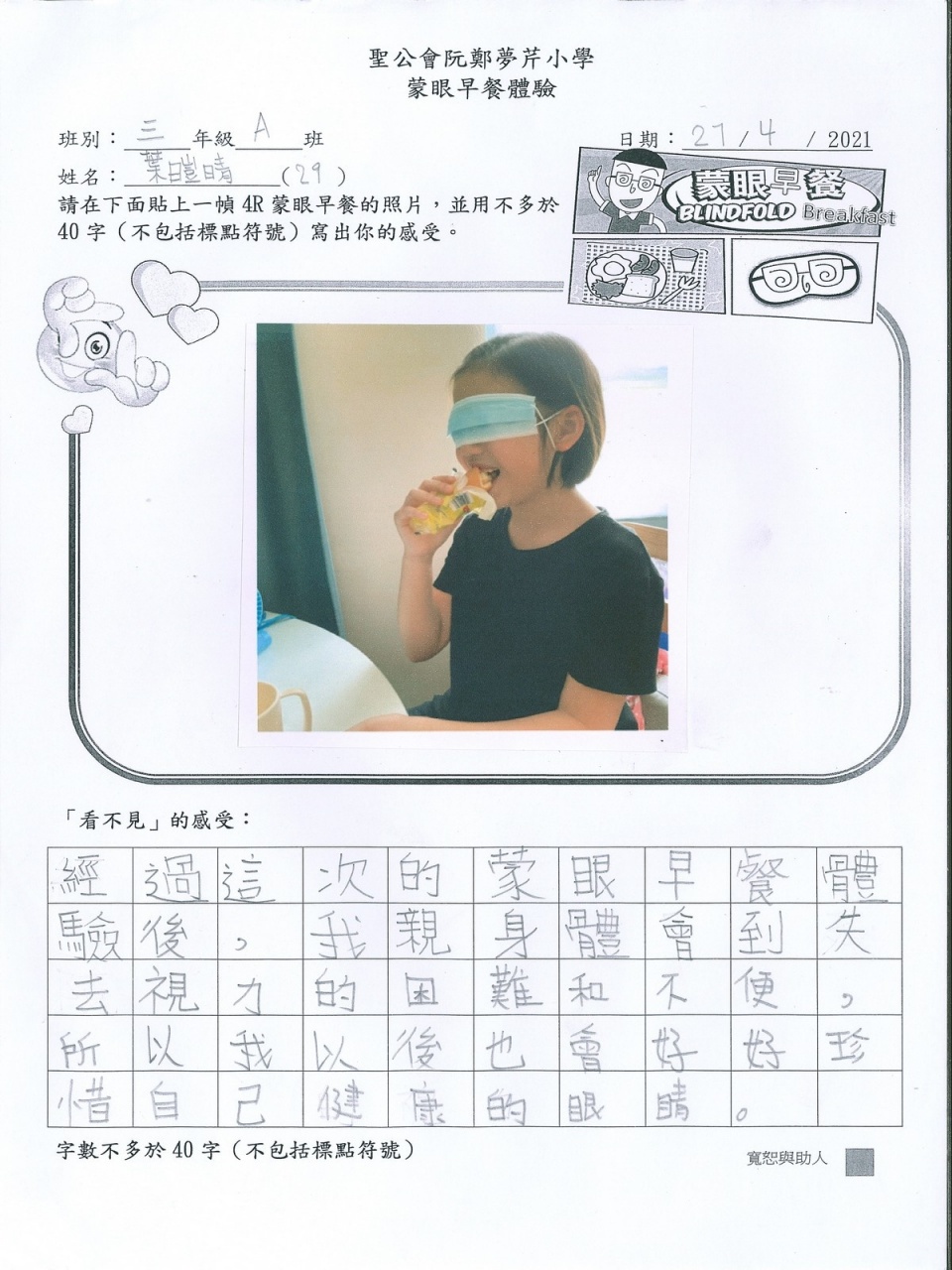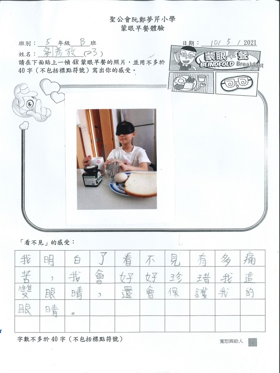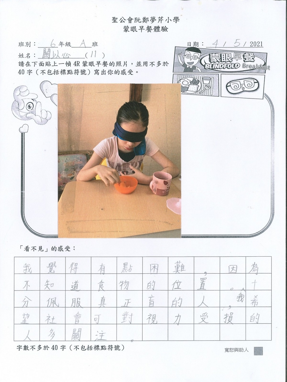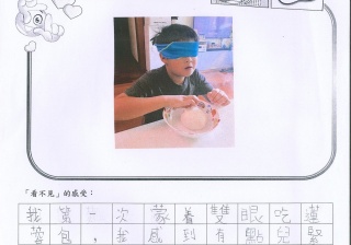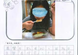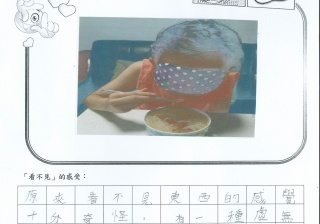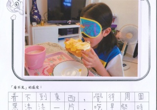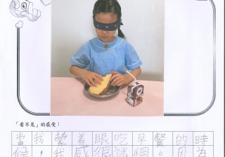 本年度校風及學生支援組的目標是「寬恕與助人」,為讓學生體驗失去視力的困難與不便,從而領略健康視力之珍貴,並捐助世界上有需要的人,本校在27/4-25/5舉行「蒙眼早餐體驗及奧比斯籌款活動」。 現展示部份「蒙眼早餐體驗工作紙」,讓同學一同分享在黑暗中用膳的感受。