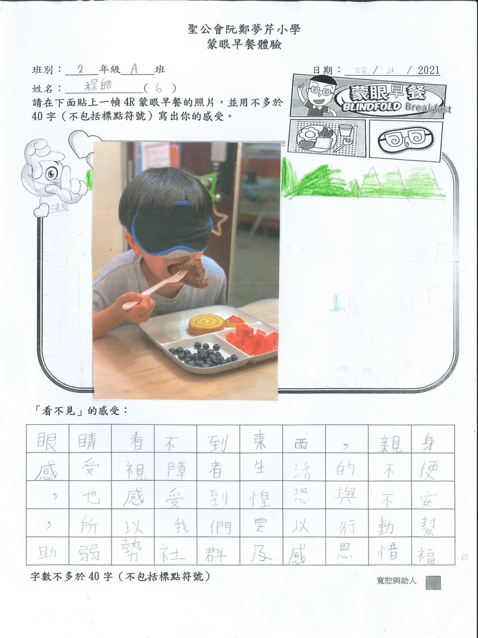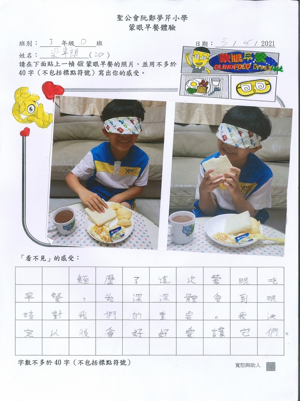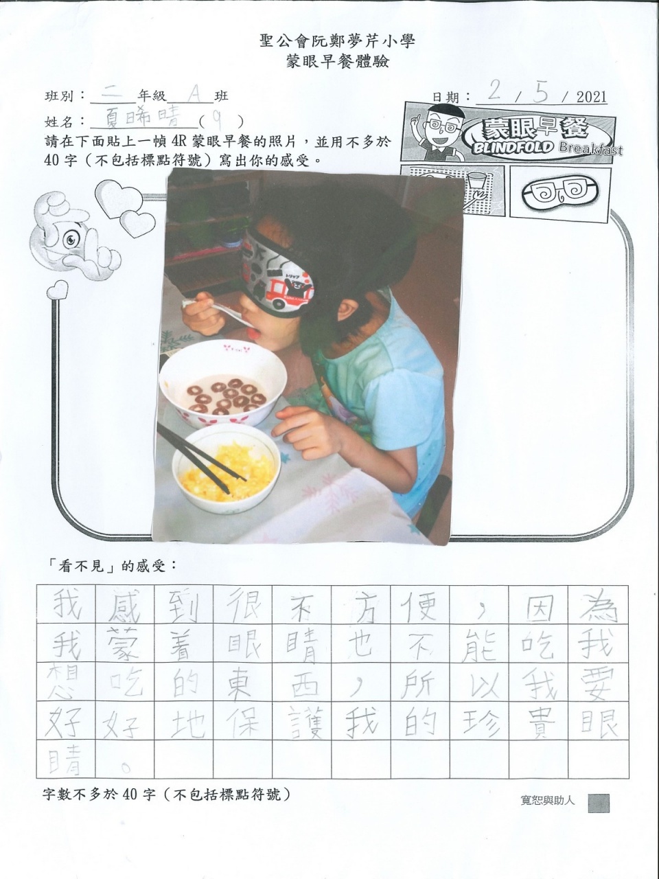 本年度校風及學生支援組的目標是「寬恕與助人」,為讓學生體驗失去視力的困難與不便,從而領略健康視力之珍貴,並捐助世界上有需要的人,本校在27/4-25/5舉行「蒙眼早餐體驗及奧比斯籌款活動」。 現展示部份「蒙眼早餐體驗工作紙」,讓同學一同分享在黑暗中用膳的感受。
