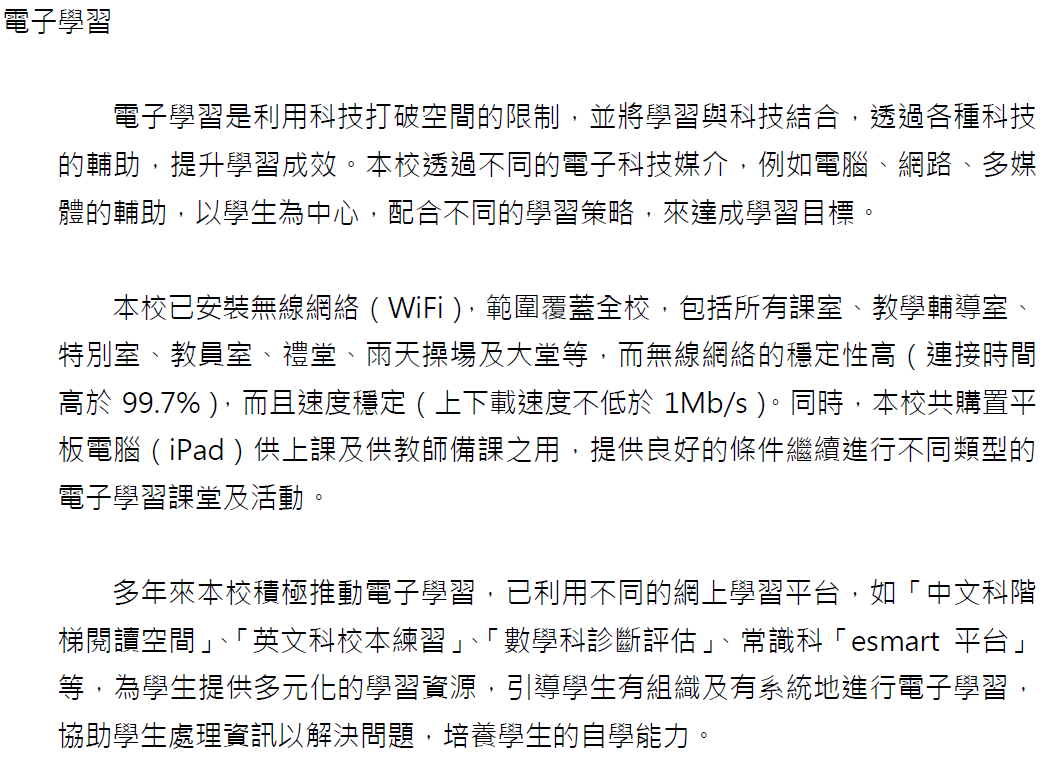 電子學習 全校已安裝無線網絡(WiFi),範圍覆蓋全校,包括所有課室、教學輔導室、特別室、教員室、禮堂、雨天操場及大堂等,而無線網絡的穩定性高(連接時間高於99.7%),而且速度穩定(上下載速度不低於2Mb/s)。同時,本校共購置約240部平板電腦(iPad)供上課,及約40部供教師備課之用,提供良好的條件繼續進行不同類型的電子學習課堂及活動。