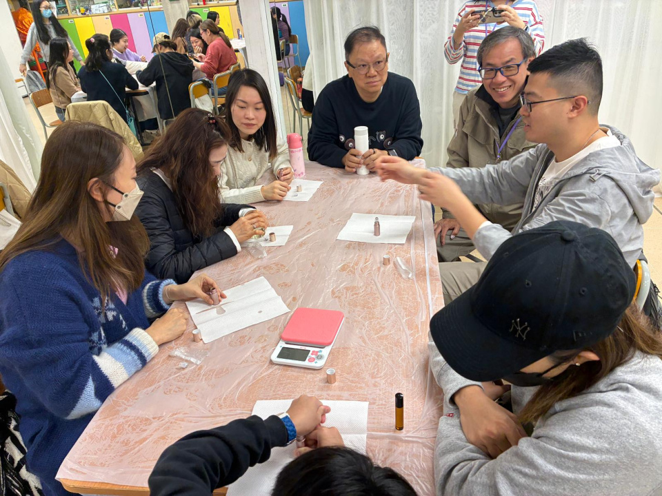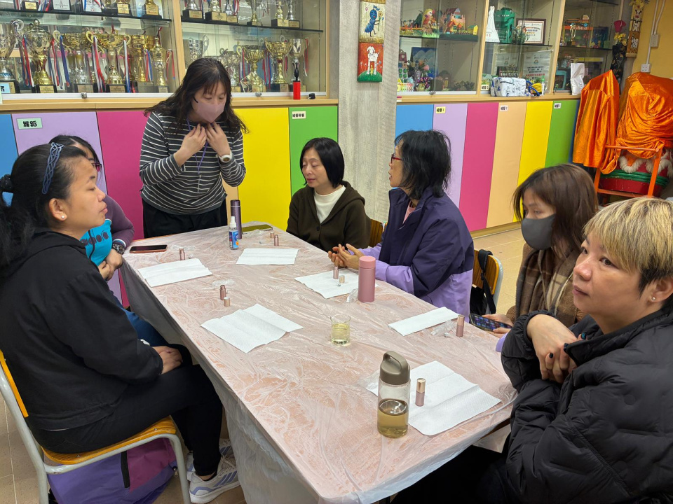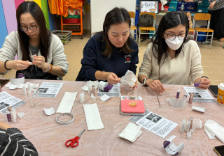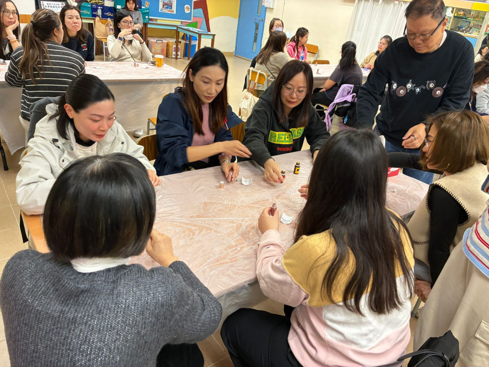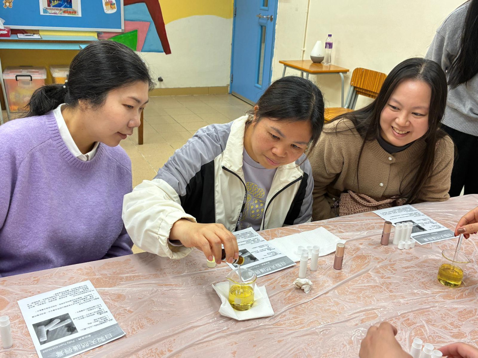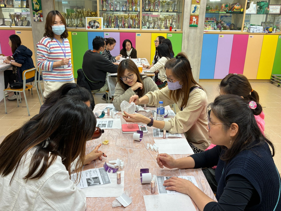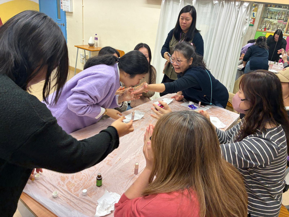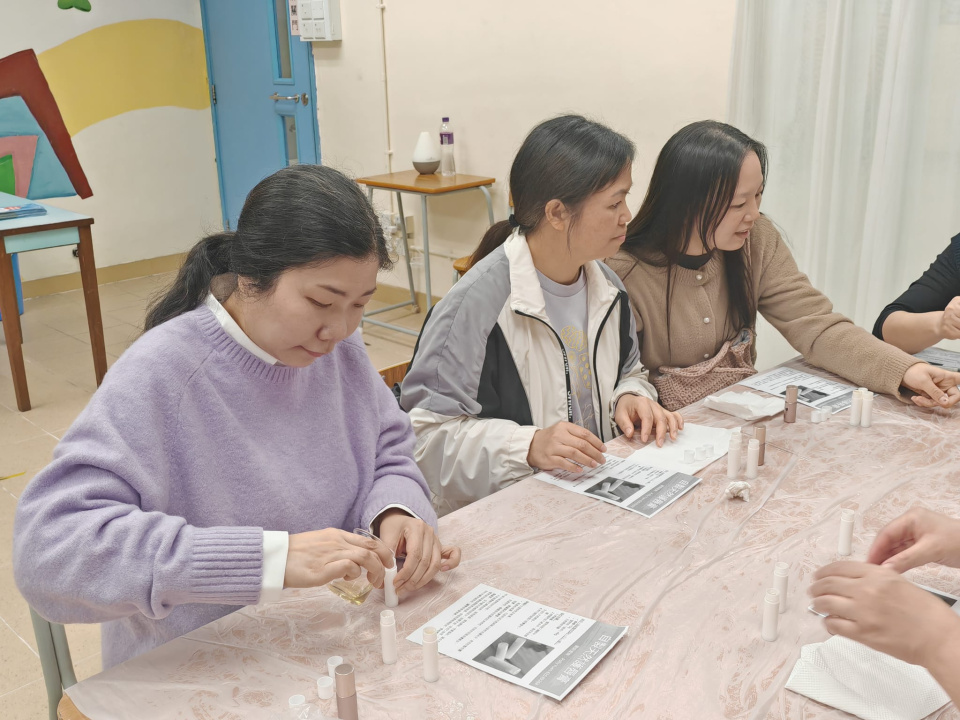 學校近日與睦鄰家庭服務中心合作,舉辦了災後家長情緒支援工作坊,同時邀請了輔導家庭治療師等在家長小組中提供支援。根據研究,香薰治療有助災難後,透過嗅覺的刺激,舒緩突發的情緒壓力,從負能量中抽離及歇息。席間,由香薰治療師帶領製作香薰滾珠棒及潤唇膏,參加者在手作期間,也在輔導人員的協助下打開話匣子,互相支持。除了學習如何使用精油放鬆情緒外,家長們亦相互分享子女的教養技巧,在家長活動中獲得連繫及支持。