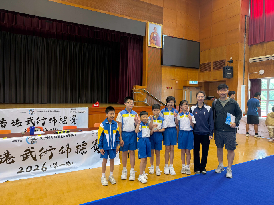 恭喜本校武術校隊於4月12日舉行之2026香港武術錦標賽(第一站)比賽中奪得佳績,於集體五步拳項目中取得冠軍,有此佳績,實有賴家長們的鼎力支持,教練老師用心訓練,同學們刻苦練習,期望同學繼續努力,更上一層樓。