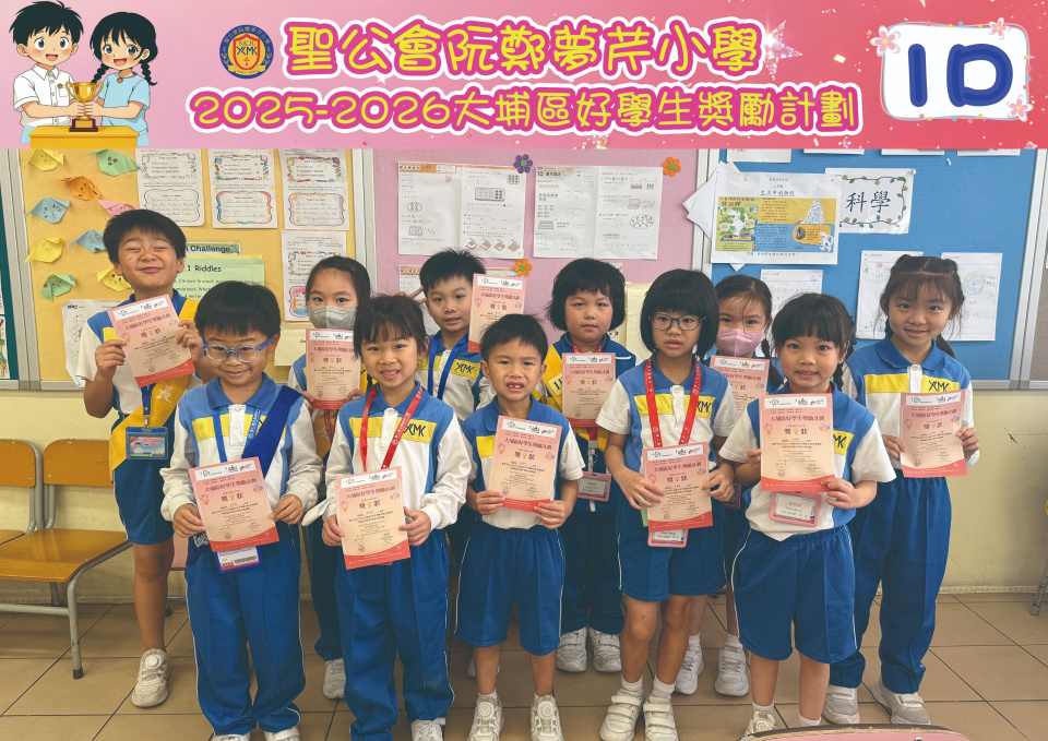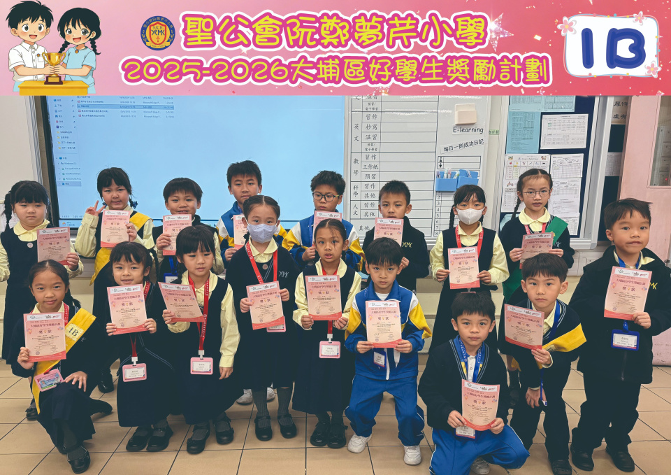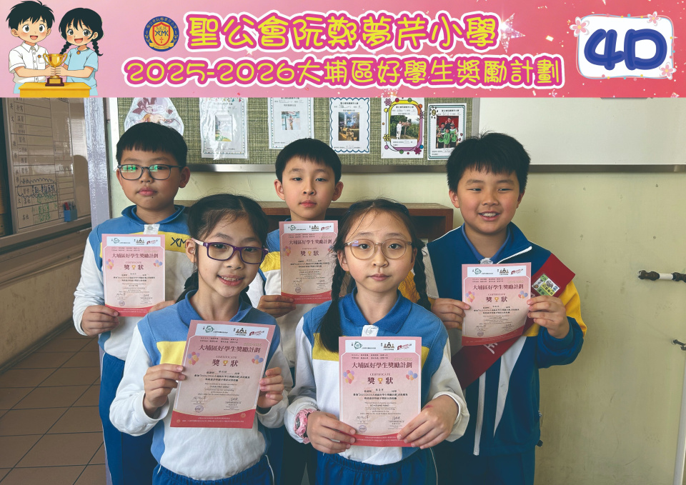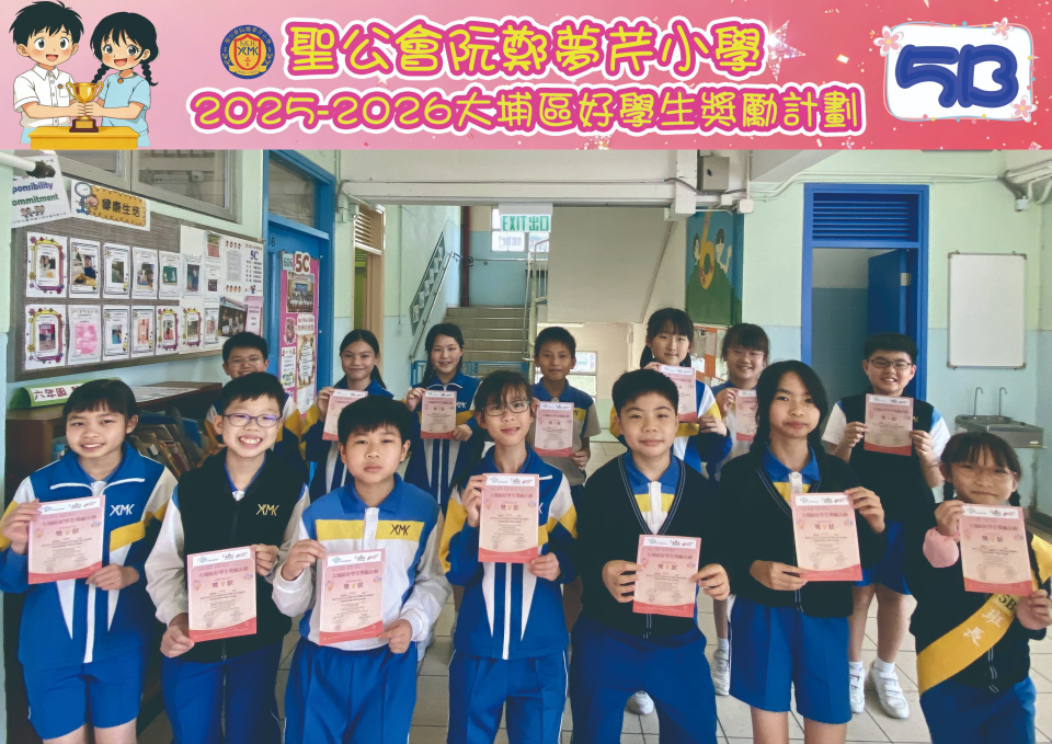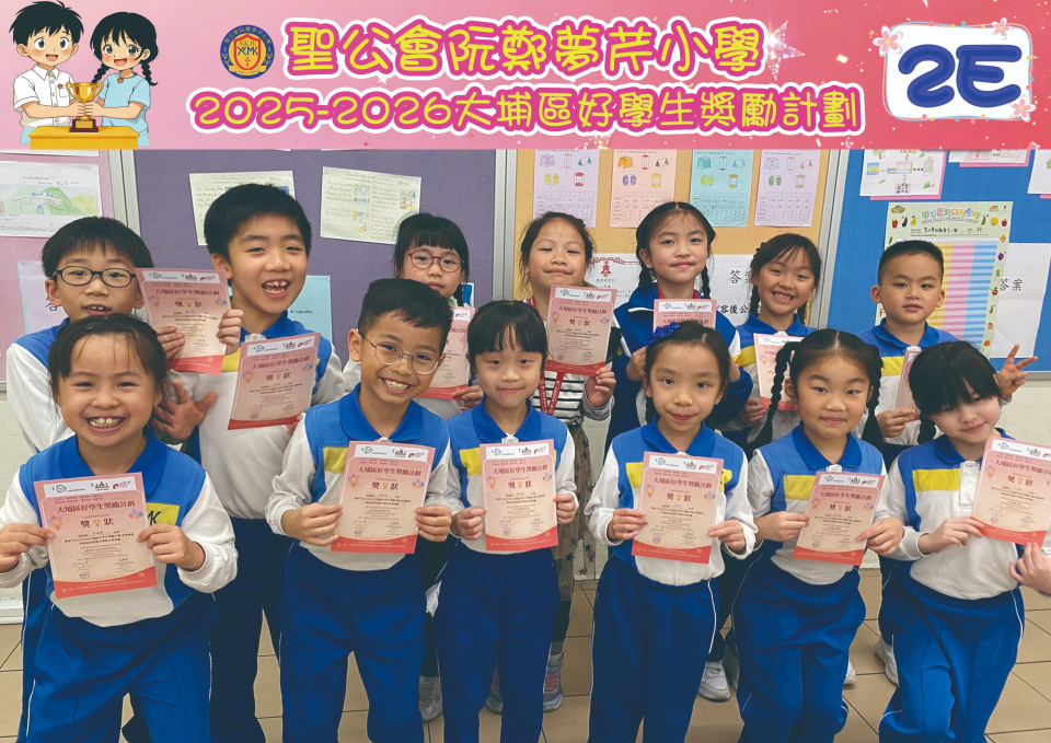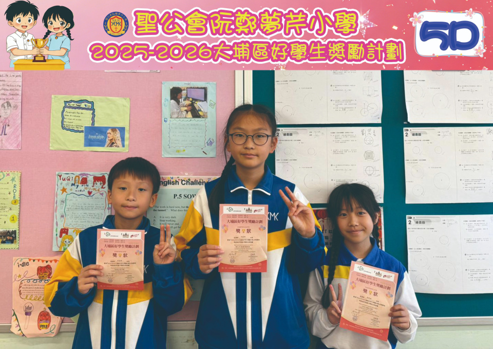 由大埔學校聯絡委員會舉辦的 2025/202『 大埔區好學生獎勵計劃 』,鼓勵大埔區學生積極進取,提昇自我形象。 本年度,本校有約四百多位學生獲得大埔區好學生獎狀,其中6A林思齊同學、6B蔣栢麟同學和6C劉思惠同學更獲得突出學生獎,恭喜各位獲獎同學!
