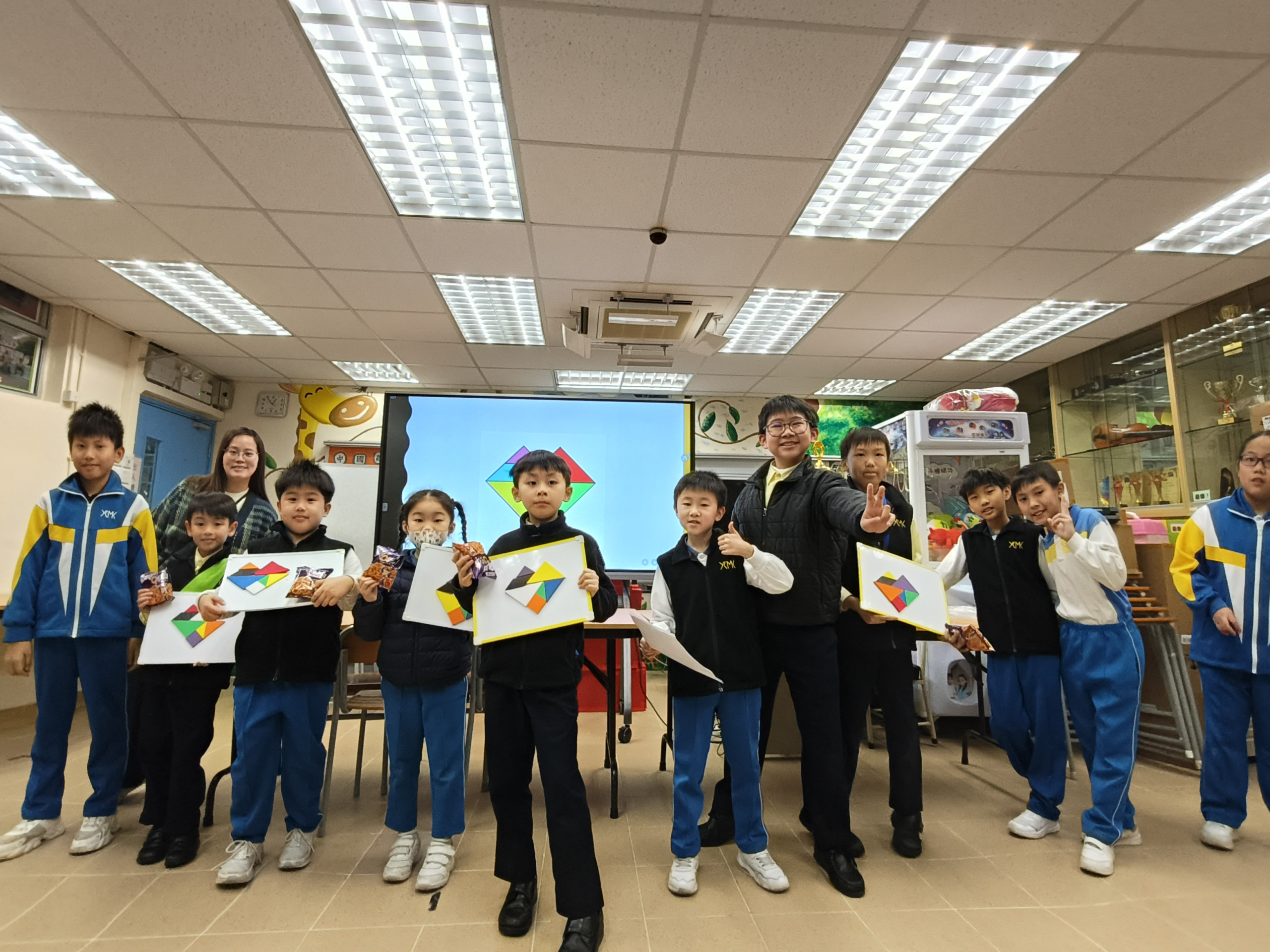 6A班的林思齊和李炎桐同學以生動的簡報介紹了中國古代的七巧 板除了展示七巧板的起源與歷史背景,還詳細說明了它的玩法與 背後的數學原理。為了加深同學們的理解,他們特別設計了互動 題目,現場答對的同學可獲得獎勵。此次活動兼具知 識性與趣味性, 充分展現了中國數學的悠久歷史與智慧。