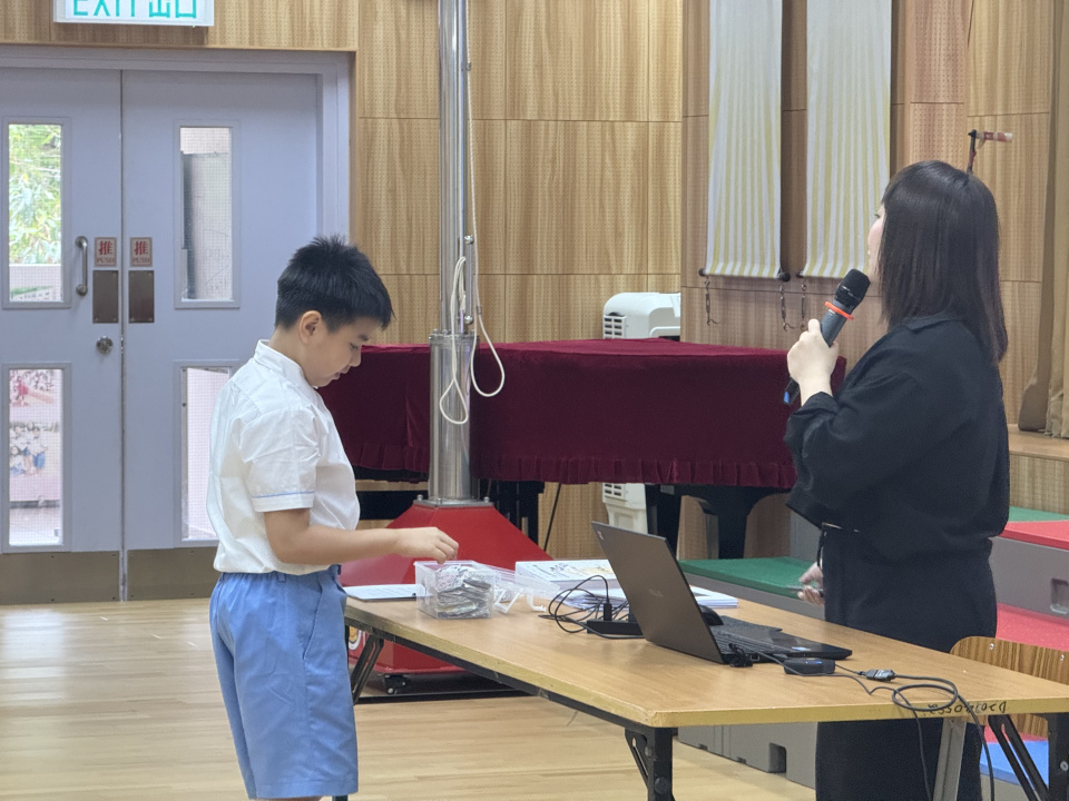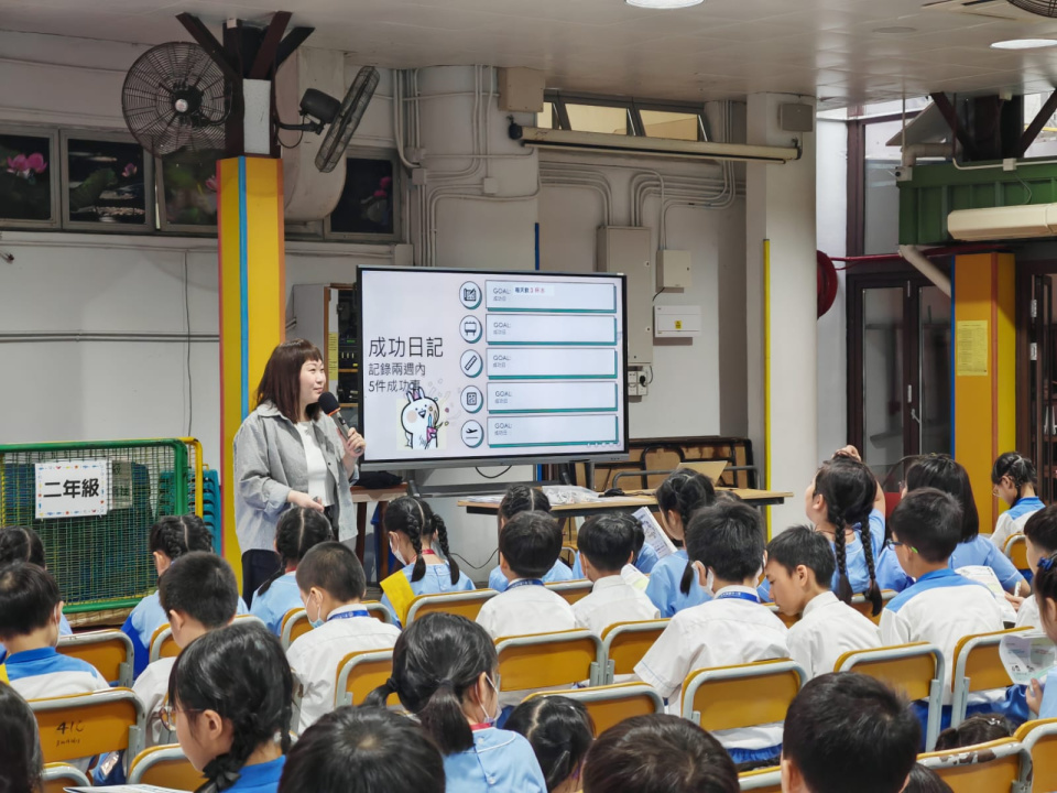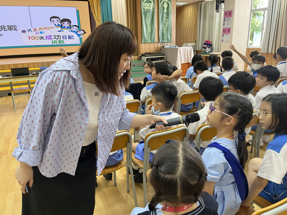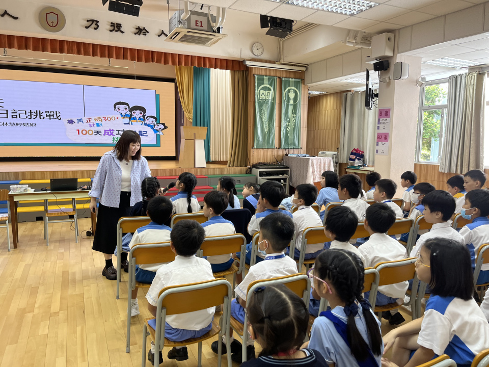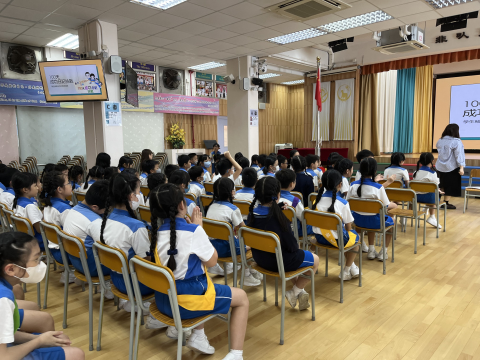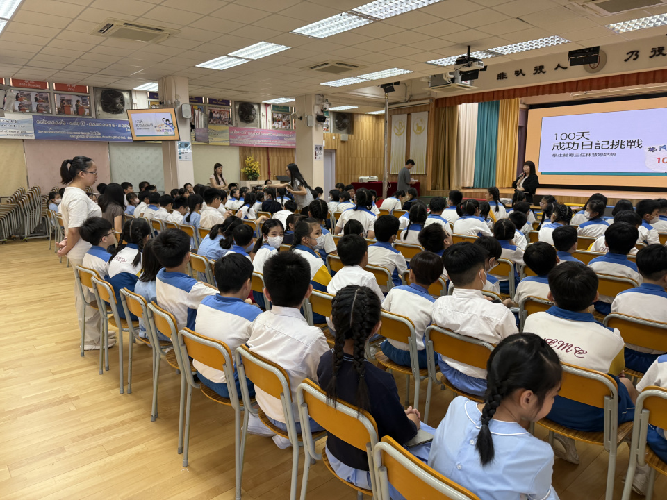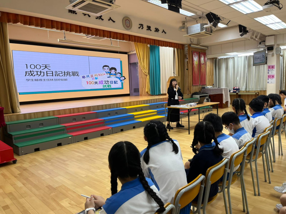 學生輔導主任林姑娘向同學們介紹了本年度 的校本輔導活動——《100天成功日記挑戰》。同學們對此表現出極濃厚的興趣,紛紛表示願意參與。我們也邀請了家長們一起嘗試完成這項挑戰,現時已有許多家長積極響應!希望同學們完成挑戰後,將日記交給輔導組,以換取「獎勵襟章」,即可以在學期結束前在校內佩戴。此外,同學們和家長可以一起合作,在學期結束前完成挑戰,從鄧校長手中領取獎狀呢!