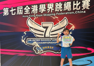 第七屆全港學界跳繩比賽中,4E王贍德同學憑藉出色的技術與穩定的發揮,在 30 秒前繩速度賽項目中脫穎而出,最終奪得亞軍,為校爭光。