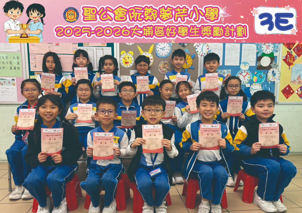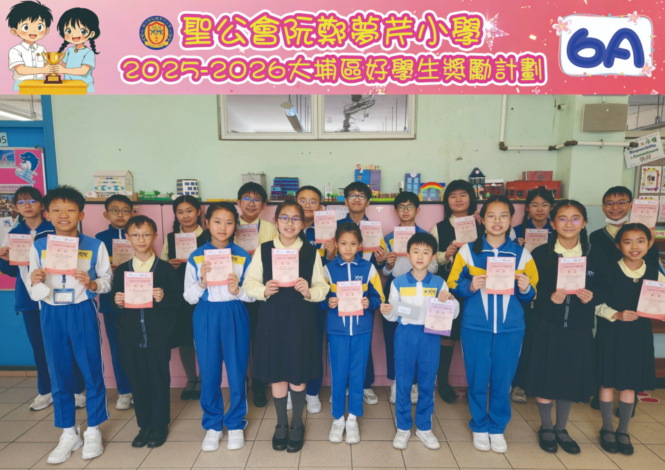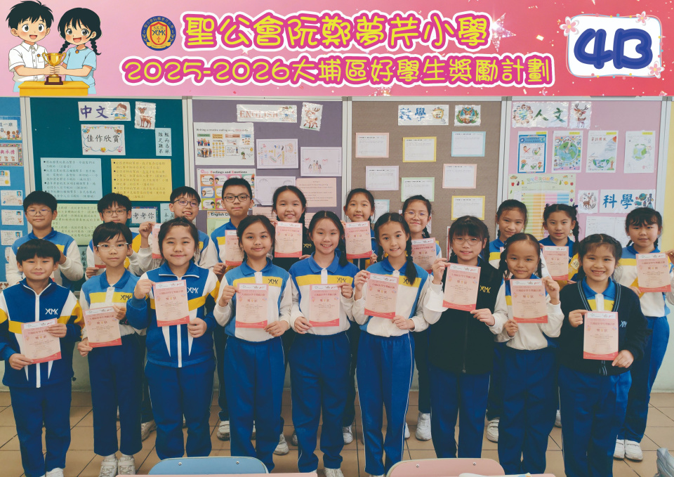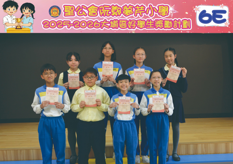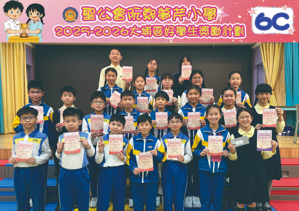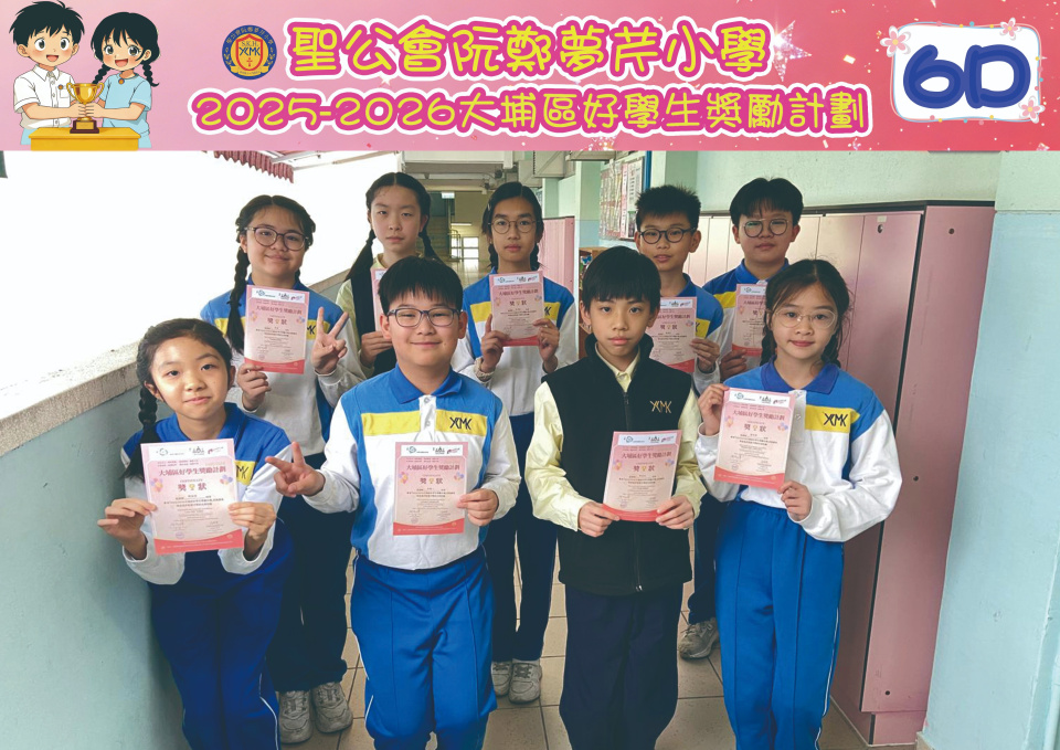 由大埔學校聯絡委員會舉辦的 2025/202『 大埔區好學生獎勵計劃 』,鼓勵大埔區學生積極進取,提昇自我形象。 本年度,本校有約四百多位學生獲得大埔區好學生獎狀,其中6A林思齊同學、6B蔣栢麟同學和6C劉思惠同學更獲得突出學生獎,恭喜各位獲獎同學!