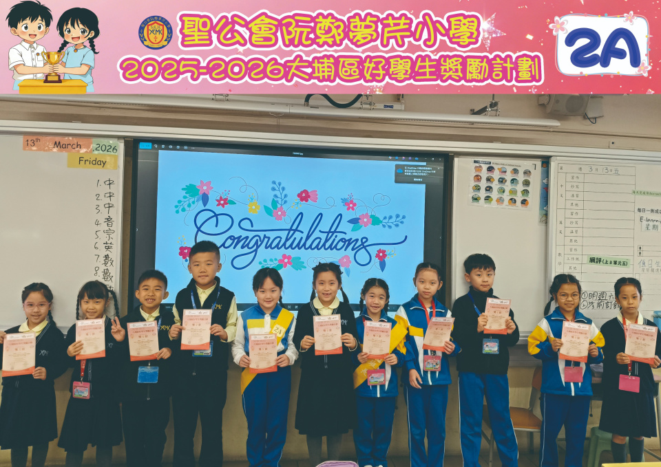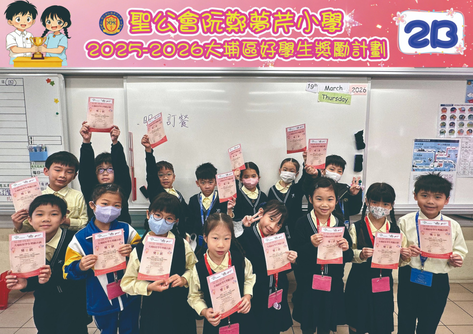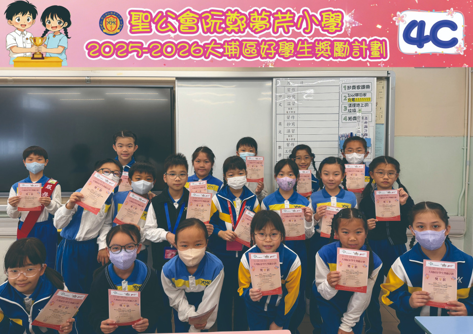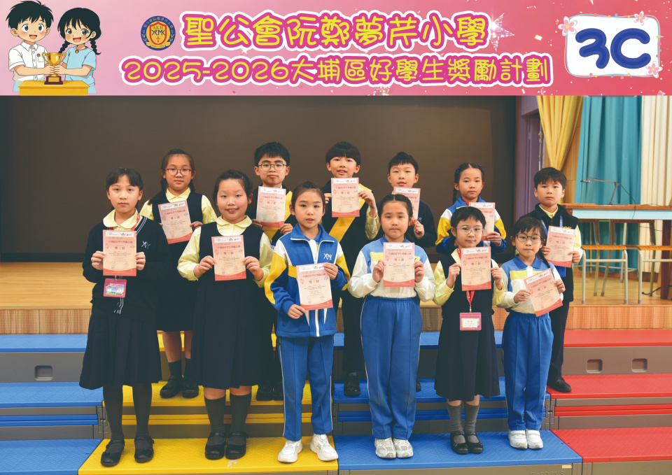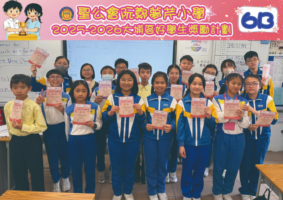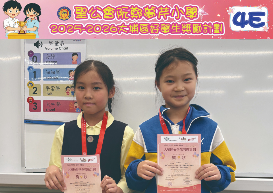 由大埔學校聯絡委員會舉辦的 2025/202『 大埔區好學生獎勵計劃 』,鼓勵大埔區學生積極進取,提昇自我形象。 本年度,本校有約四百多位學生獲得大埔區好學生獎狀,其中6A林思齊同學、6B蔣栢麟同學和6C劉思惠同學更獲得突出學生獎,恭喜各位獲獎同學!
